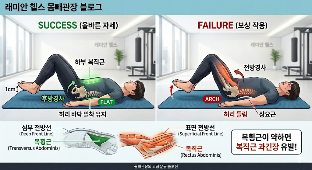 - 깨우기 (Activation): 먼저 호흡을 통해 잠자고 있는 **복횡근(심부 전방선)**을 활성화해야 합니다.